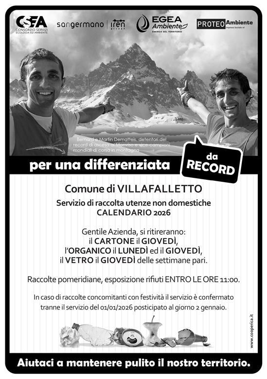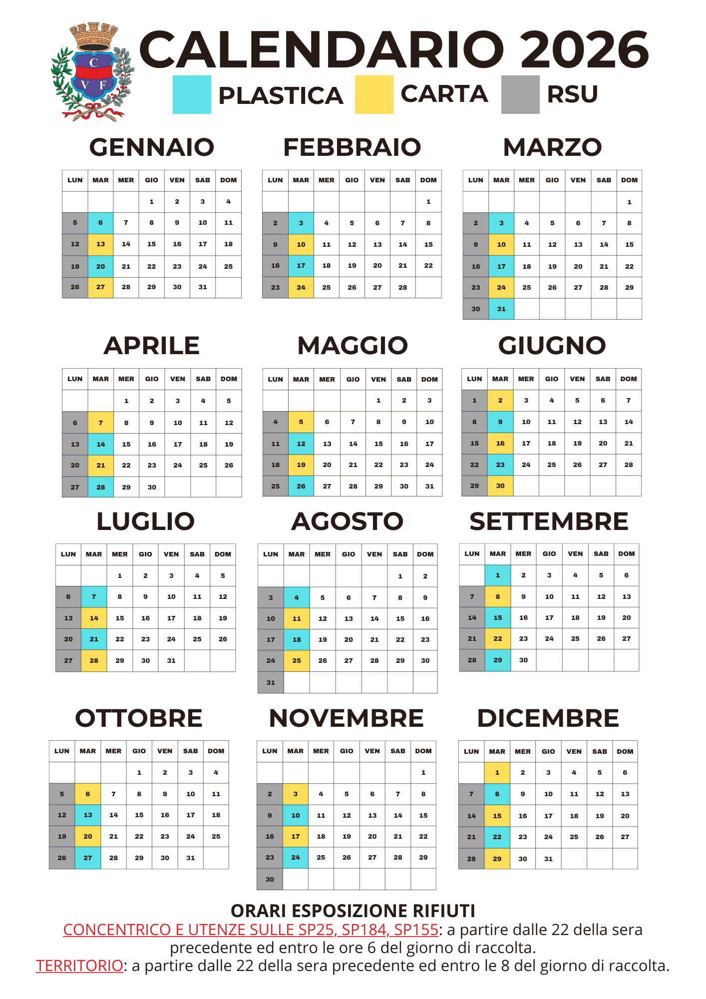 In allegato il calendario 2026 della raccolta di rifiuti del Comune di Villafalletto.