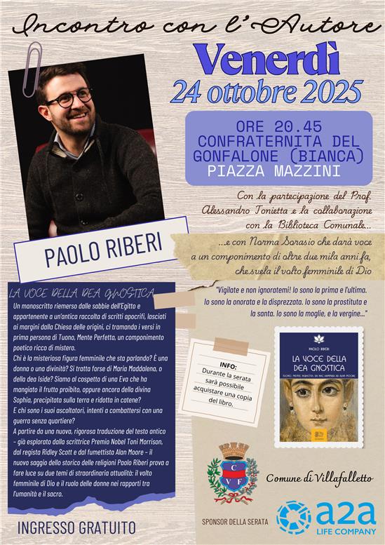Il libro protagonista dell’incontro, "La voce della Dea Gnostica", di Paolo Riberi, nasce da un manoscritto riemerso dalle sabbie dell’Egitto e appartenente a un’antica raccolta di scritti apocrifi, lasciati ai margini dalla Chiesa delle origini, ci tramanda i versi in prima persona di Tuono, Mente Perfetta, un componimento poetico ricco di mistero.