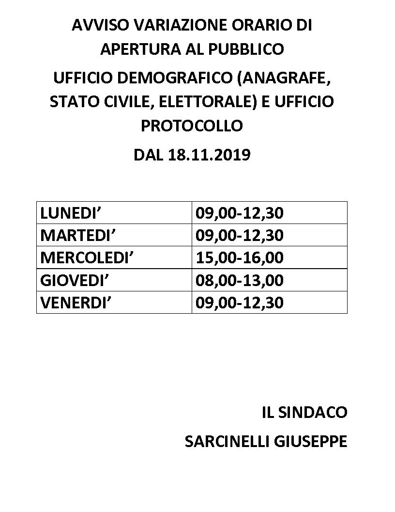 VARIAZIONE ORARIO DI APERTURA AL PUBBLICO UFFICIO DEMOGRAFICO - PROTOCOLLO ...