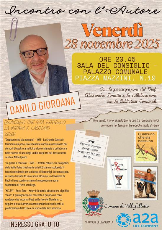 Il Comune di Villafalletto, in collaborazione e con la partecipazione del prof. AlessandroTonietta, ha il piacere di invitare la cittadinanza al quinto appuntamento della rassegna "Incontro con l'Autore" con lo scrittore Danilo Giordana che si terrà venerdì 28 novembre alle ore 20.45 nella sala del Consiglio - Palazzo Comunale.